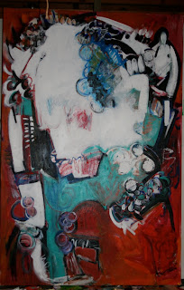It's about want I want to do with the idea. The model to the painting and how to abstract it. I'm trying to learn from myself. The painting is 4 x 5 ft. Also need to put it aside,finish the notebook and concentrate on building my found object sculpture.I also have to step back and decide what is going where.I end up spending time on these experiments like a mad scientist and forget everything else. I merged the model on to the painting so I'm thinking of a large transparent drawing glued to the surface of the canvas.
